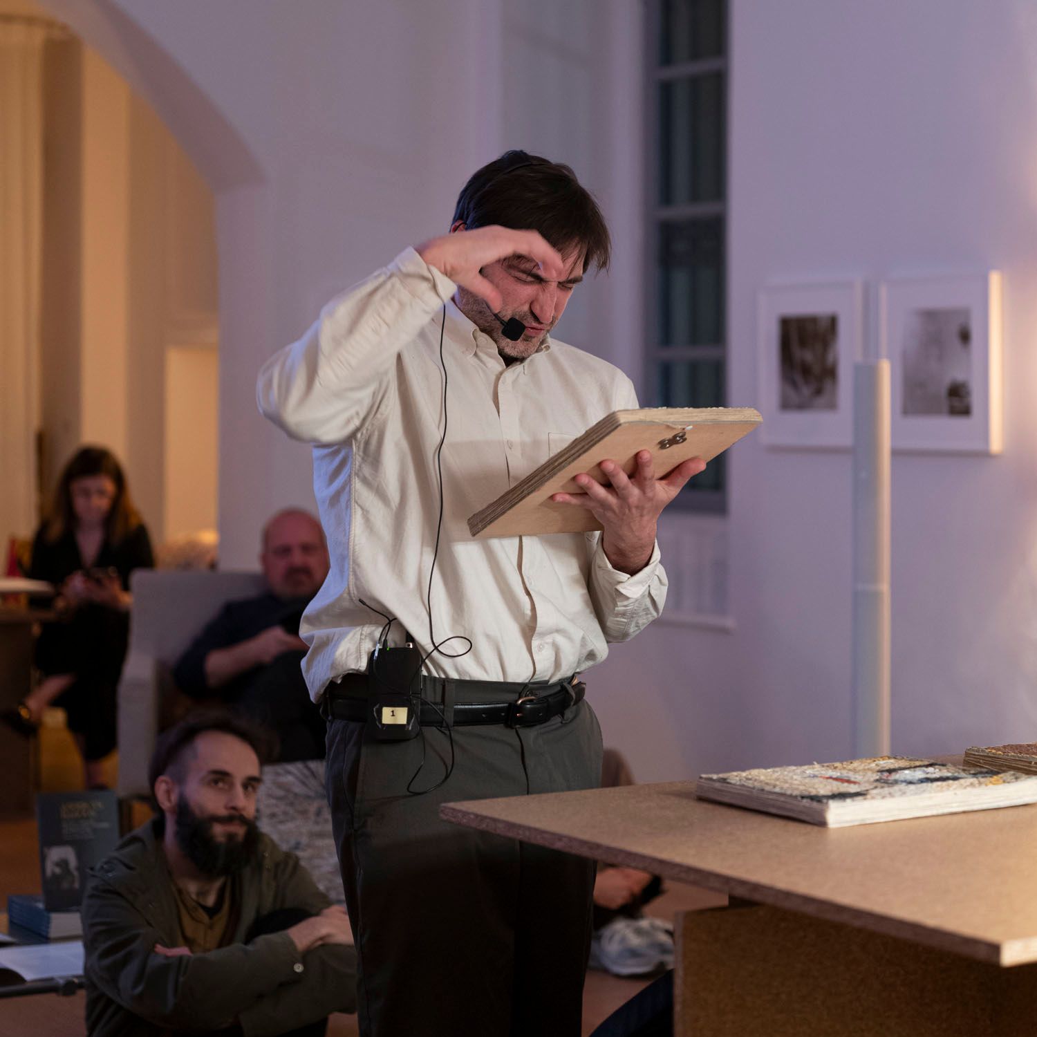 “During the presentation, Francesco Cavaliere read some travel mosaics, 20x20 cm reading mosaics that, like the pages of a book, can be flipped through and read aloud to tell the hilarious story of Sijuaq the Seer Curlew. This story constitutes the second part of the Solimandante cycle, a magical and chivalric audio tale pressed on vinyl by the attentive record label Poole Music, founded by Henry Smith & Asher Woodworth in Portland, Maine, in 2020.”