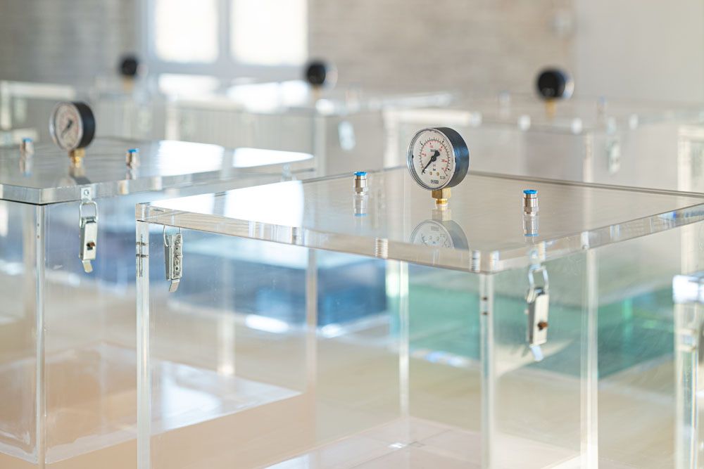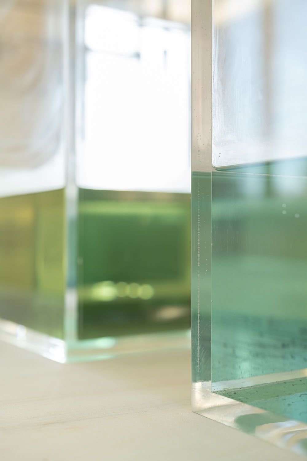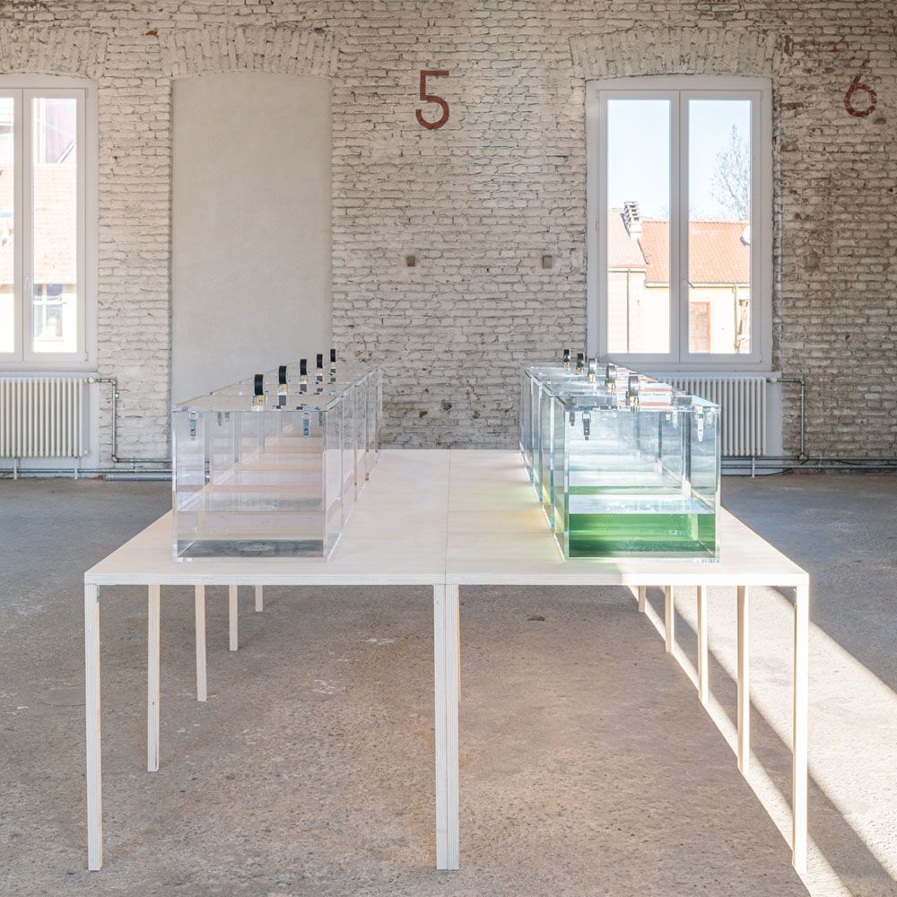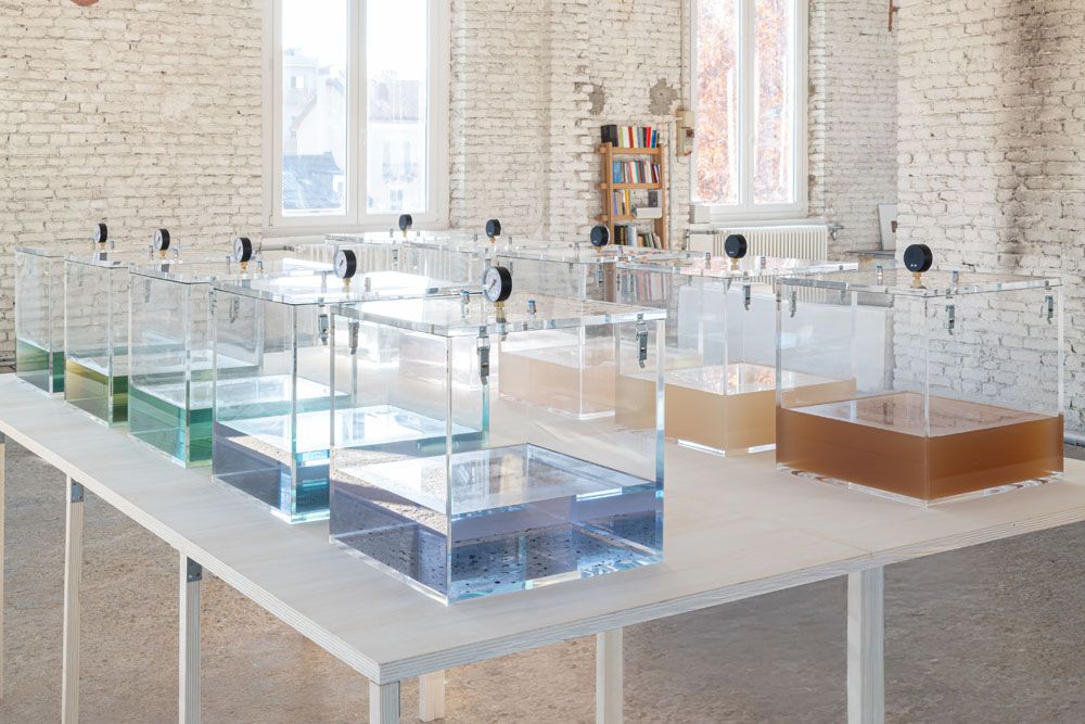In collaboration with SyIvia Kouvali, Iris Touliatou presented Science and Science After Science, 2024. Previously shown at NEON City Project 2024, Athens, two dehumidifiers were installed over a one-year period to maintain optimal humidity levels in the Library of Science of the National Hellenic Research Foundation, Athens, Greece. The water collected during this process was used to extract ink and paper from printed matter acquired through NHRF’s record destruction protocols.